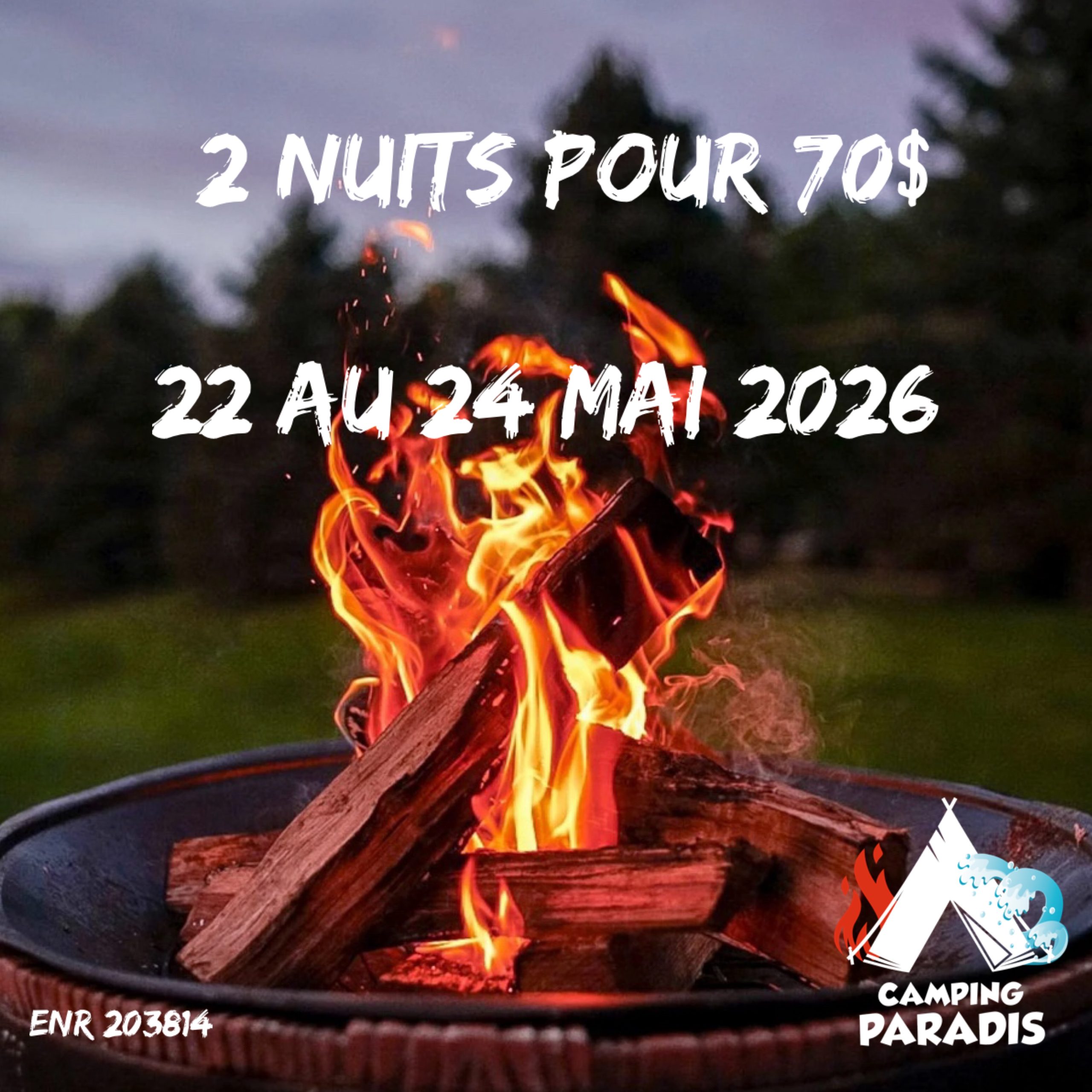 Du 22 au 24 mai 2026 2 nuits pour 70$. Taxes en sus.